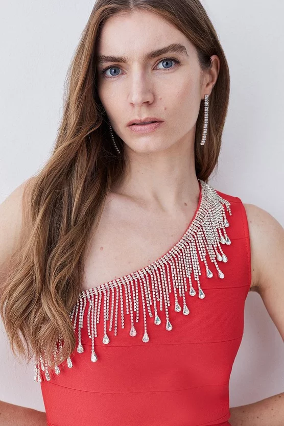 Steal the show in this glamorous midi dress. The asymmetrical, one-shoulder neckline is adorned with diamante tassels for a touch of opulence, while the bandage design naturally sculpts the silhouette. The dress flares out to a mermaid-style skirt, adding a touch of feminine allure.