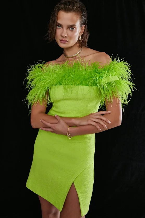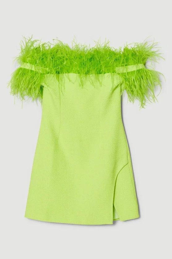 Revising a nostalgic silhouette with the tactile dimension of exaggerated feather trim, this sculpting mini dress is composed from elegant boucle for a timeless finish. Appearing in a zesty hue, pair with tonal stilettos for a dopamine-inducing effect.
