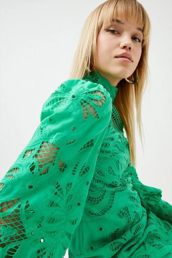 Nodding to the opulence of another era, this sumptuously crafted mini dress comes detailed with fine cutwork and scalloped trims. Accentuate its softly puffed sleeves, artisanal details and delicately buttoned cuffs with strappy heels for sunset cocktails.