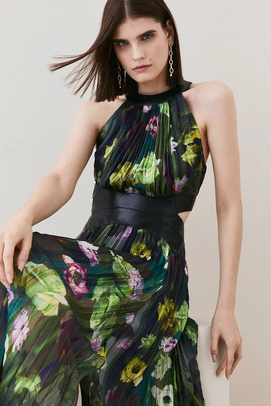 Exuding powerful feminine energy, this floral maxi dress is the perfect addition to any wardrobe. Subtle metallic threading adds a sophisticated shimmer, while a pleated georgette skirt gently swishes as you walk.