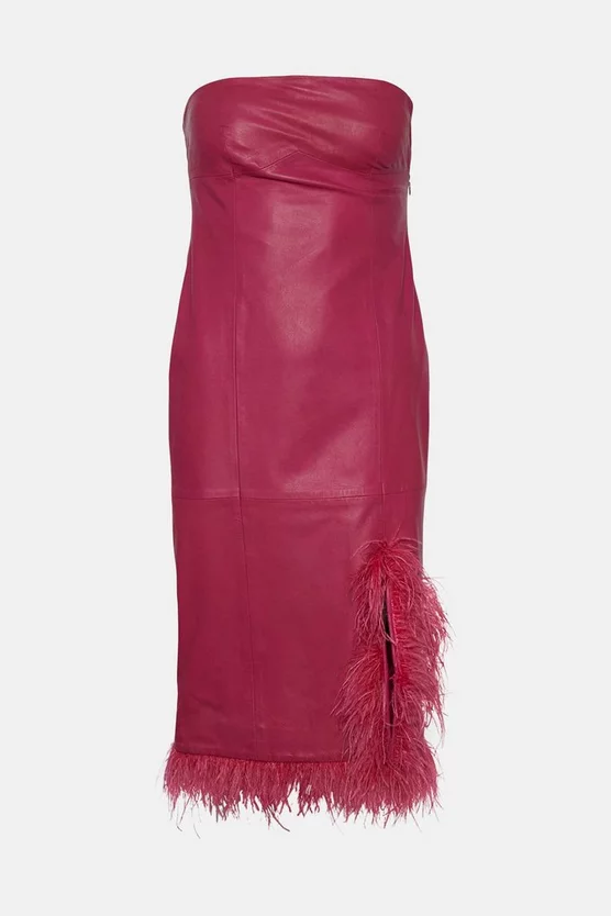 Leather and feathers – the ultimate in contemporary luxury. Embrace your sensuality in thie silhouette skimming sleeveless design, further elevated with a slit detail on the leg. Trimmed with leathers on the hem of the skirt, let the design speak for itself by completing with pared back stiletto heels and simplistic accessories.