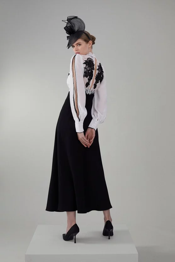 Vintage-inspired dressing at its very best, this ultra-luxe design encompasses beauty and modern decadence. Embellished with intricate lace detailing, this maxi length piece can be made contemporary through the addition of statement finishing touches.
