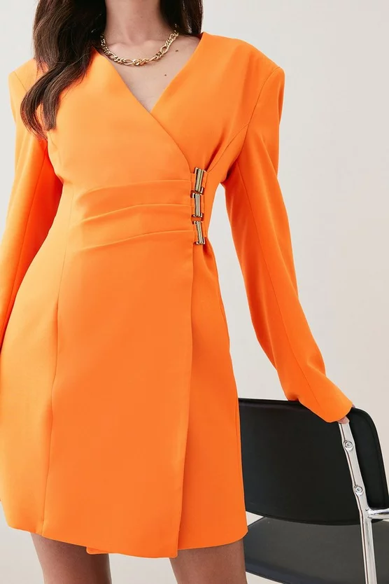 Directed by classic tailoring, this mini dress appears with bold aplomb. Defined by oversized shoulders, this sharp piece has contemporary buckled detailing to the waist-defining bodice.