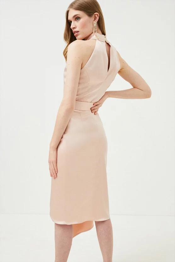Dial up the drama at extra special occasions in this elegant satin evening dress. Defined by a statement sweep of draped fabric that flows down from the belted waist, it heralds a unique take on opulent after-dark attire. Show a flash of polished skin thanks to its halter neckline and draped, knee-length skirt.