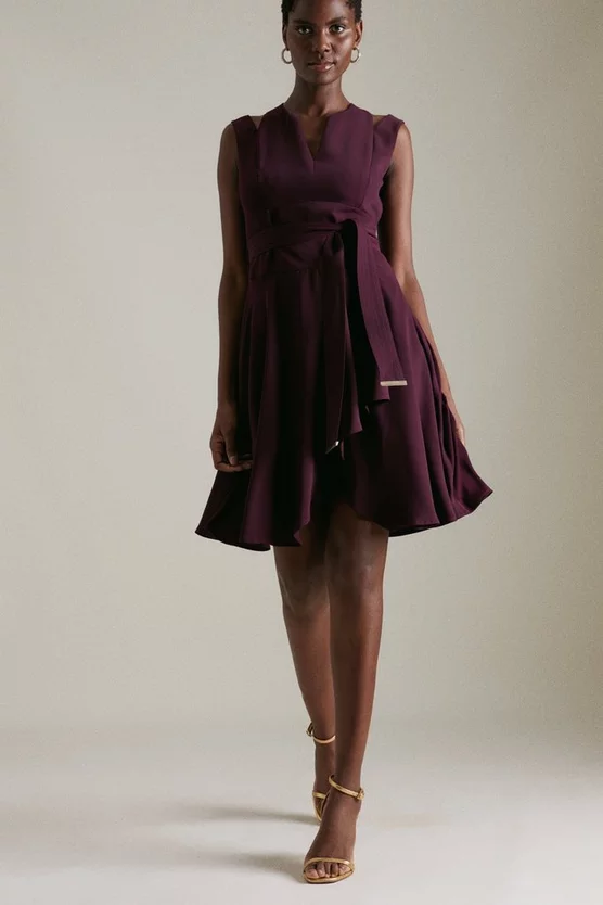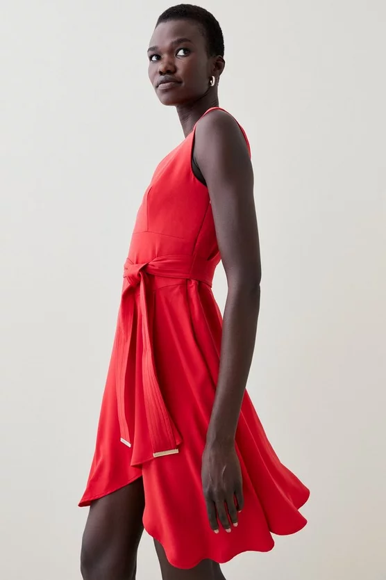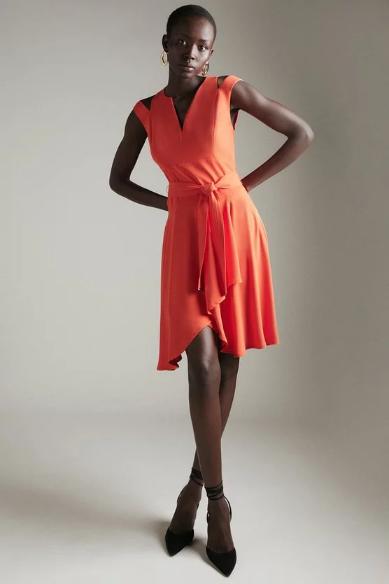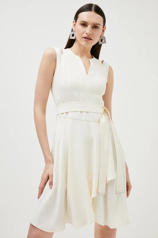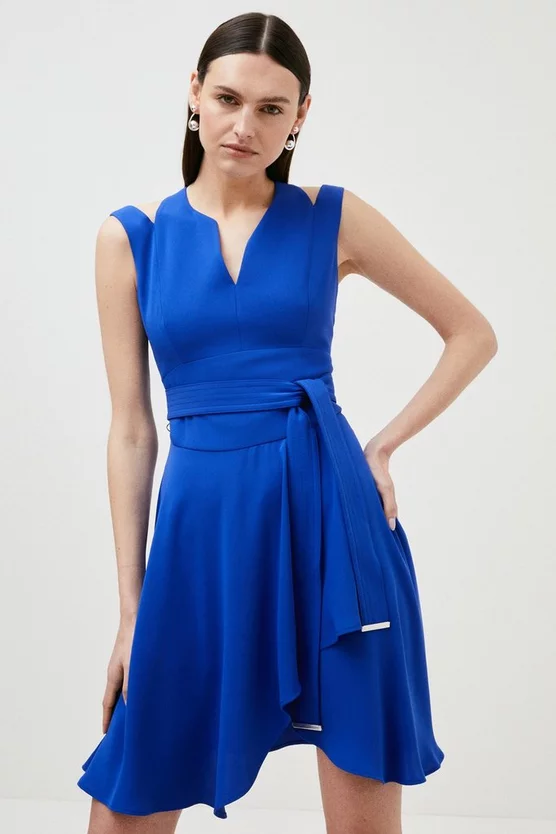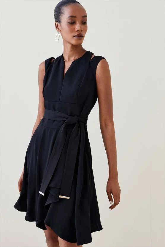Embracing both a modern and classic sensibility, this dress will be worn both now and next. Cut-out accents and glossy trims add edge, while the tailored silhouette is forever flattering. As versatile as you, its self-tie belt allows you to control the fit as you desire.