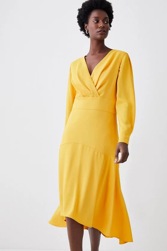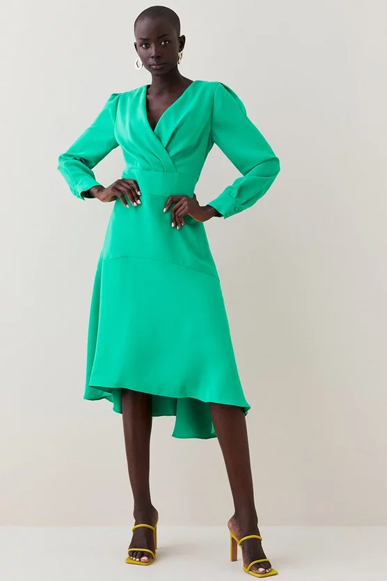 Timeless in its tactile composition, this midi dress is bound to be your next signature piece. Artfully draping the form with long puffed sleeves, this design flows into the off-kilter addition of a high-low hem.