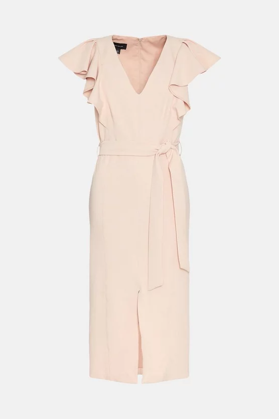 Get your sartorial frills in this elegant tailored dress. Refined by feminine ruffles that frame each sleeve, it strikes the perfect sophisticated style note for a day in the office. The ladylike pencil silhouette comes defined by a knotted waist belt to subtly cinch in your shape.