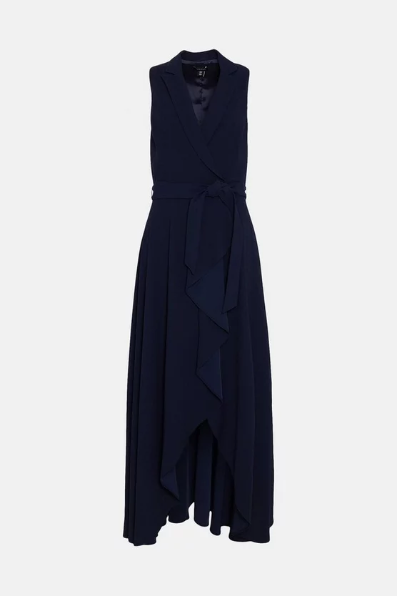 Blending the structure of a blazer dress with the soft drape of a maxi, this dynamic design ticks endless style boxes. A ladylike wrap-over front ripples down into a cascade of frills that frame the legs, all defined by a knotted waist tie to cinch in your silhouette. Add strappy colour-pop heels to elevate this unique design further.